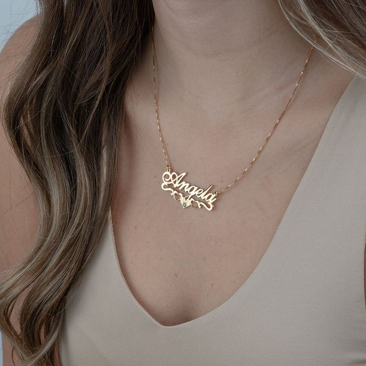 Celebrate your individuality with the personalized Birthstone Name Necklace with Underline Hearts. This beautifully crafted necklace features a delicate sideways cursive pendant adorned with three heart icons, one of which holds your chosen birthstone. The flowing script font, complemented by the heart design, adds a personal touch that makes this piece truly one-of-a-kind.